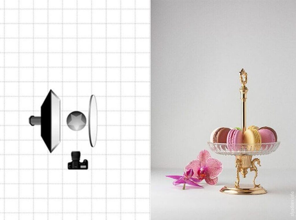 Одне джерело світла. Великий софтбокс збоку. Створюється відчуття. що світло падає з вікна. Світло із софтбоксу потрапляє як на сам десерт, так і на фон (цього дуже легко досягти, просто треба трохи погратися з напрямком софтбоксу).