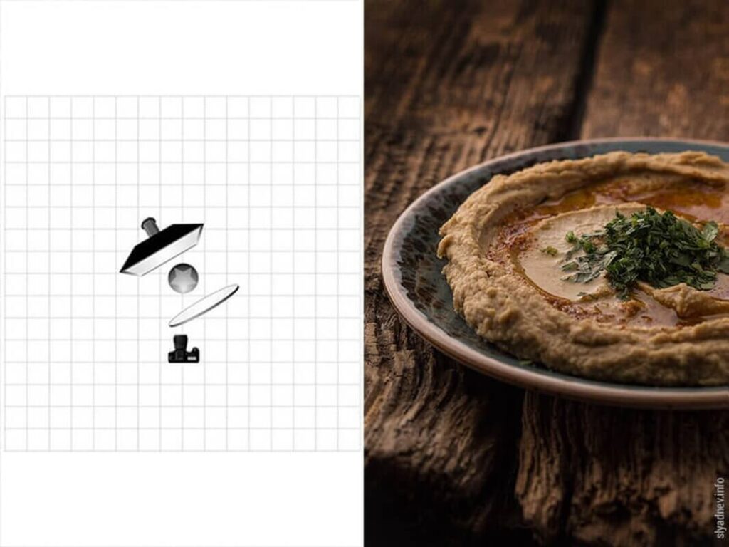 Глибока поверхня столу перегукується з глибокими візерунками самого хумуса. Мені потрібні глибокі тіні, щоб передати цей малюнок. Тому одне джерело з великим софтбоксом, під дуже гострим кутом щодо знімальної поверхні, поставлене ззаду страви, створює контрове освітлення.