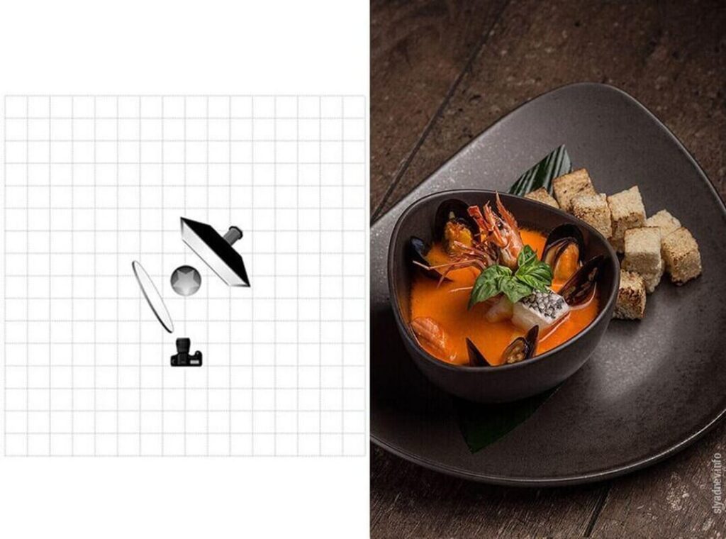 - Став джерело максимально близько до об’єкта зйомки. Поєднання близькості джерела та наявність великого софтбоксу створюють максимально м’яке та природне світло, яке так любить їжа.